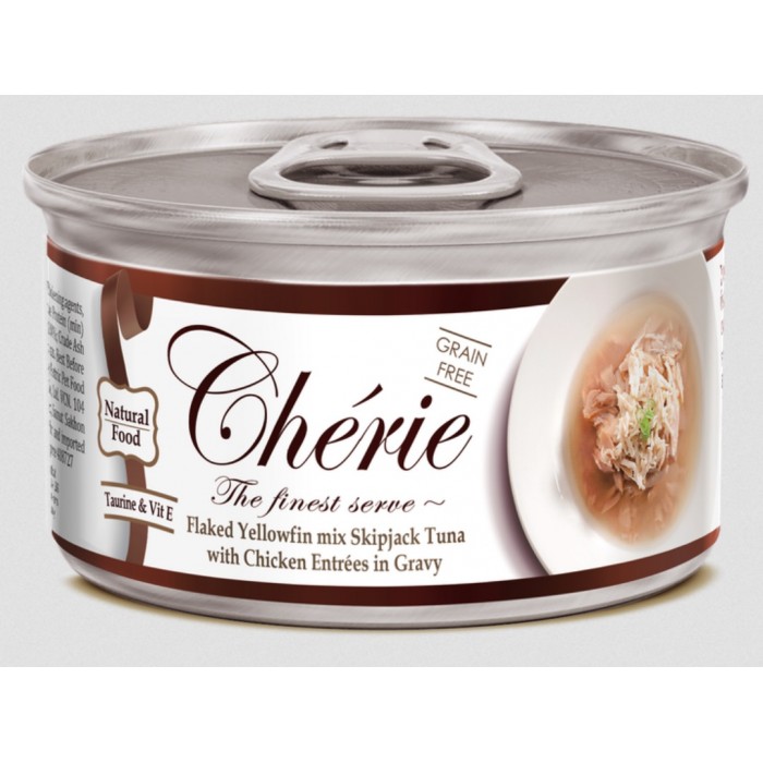 Cherie Signature Gravy Tuna with Chicken - розкішна суміш жовтоперого тунця в пластівцях в золотому співвідношенні з ніжно підрібненим білим курячим м'ясом, щоб збагатити різноманітність смаку морепродуктів насиченим соусом в спокусливих і апетитних стравах для ваших милих кішок. Завдяки простому натуральному смаку і фірмової підливи Chérie Ви отримаєте розкішну смакову сенсацію для кішок. У кожному фірмовому рецепті представлені ніжні шматочки свіжих морепродуктів в чудовому соусі.