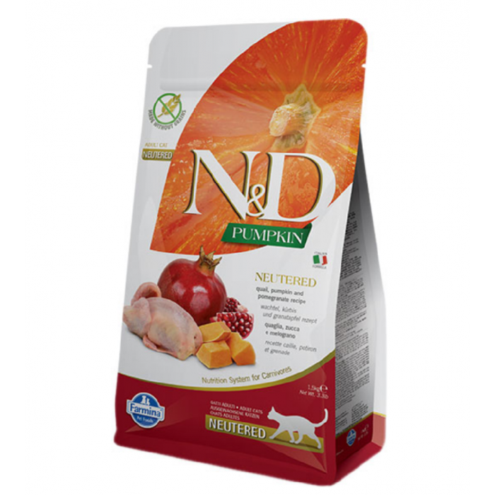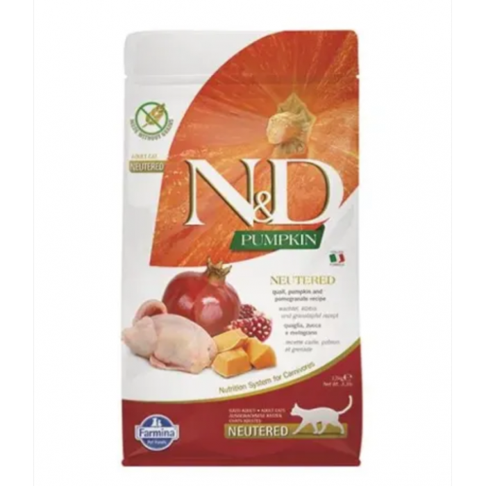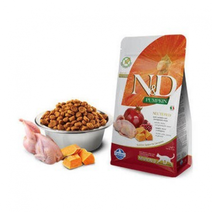 Farmina N&D Cat Pumpkin Quail Pomegranate Neutered - повноцінний сухий корм з перепілкою, гарбузом та гранатом. Призначений для дорослих кішок після стерилізації або кастрації.