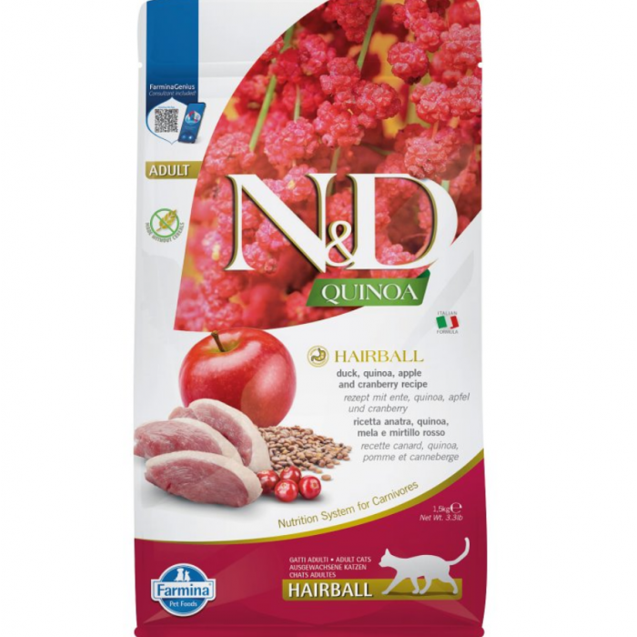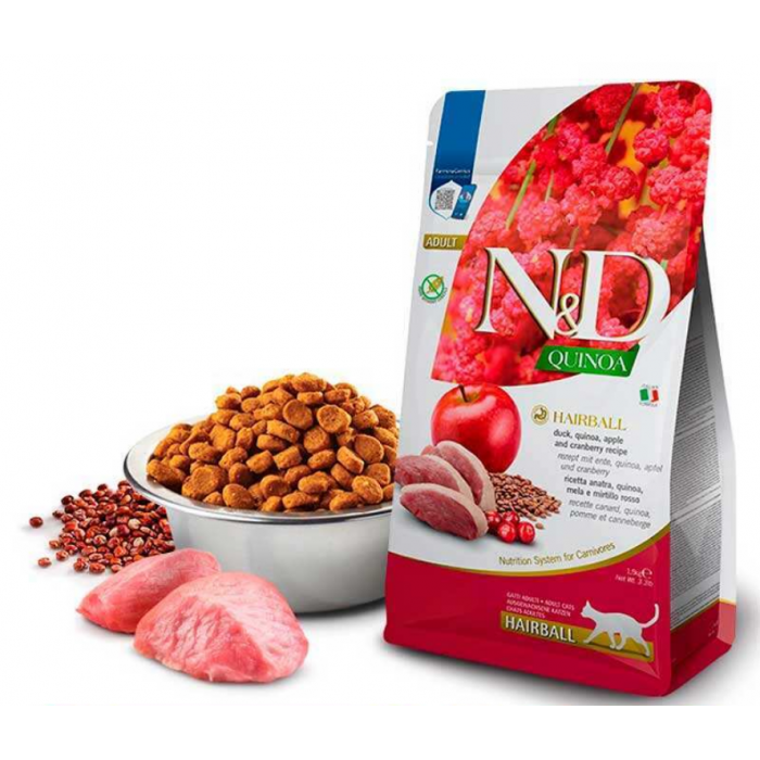 N&D Quinoa Hairball — повноцінний корм для котів, призначений для стимулювання вигнання волосяних грудочок.