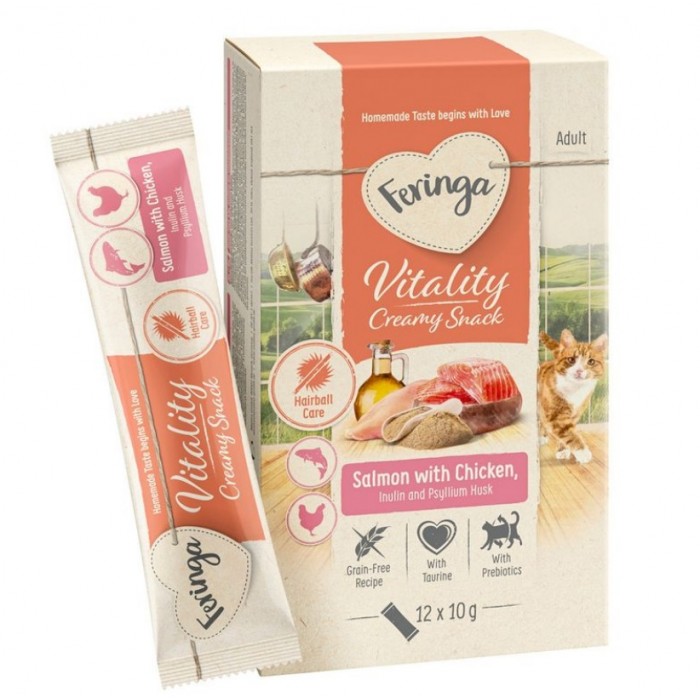 Feringa Vitality Creamy Snack був розроблений для підтримки особливих потреб вашої кішки за допомогою натуральних інгредієнтів. Наша формула для виведення вовни збагачена оліями та лушпинням псіліуму, щоб допомогти травленню. Наш смачний, беззерновий рецепт пропонує додаткову підтримку у боротьбі з волосяними кульками.
