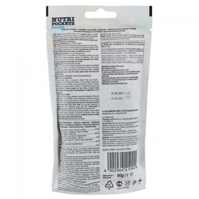 Основні характеристики GimCat Nutri Pockets Dental, ласощі для котів, подушечки для догляду за зубами, 60 г