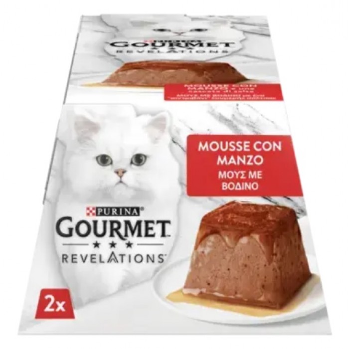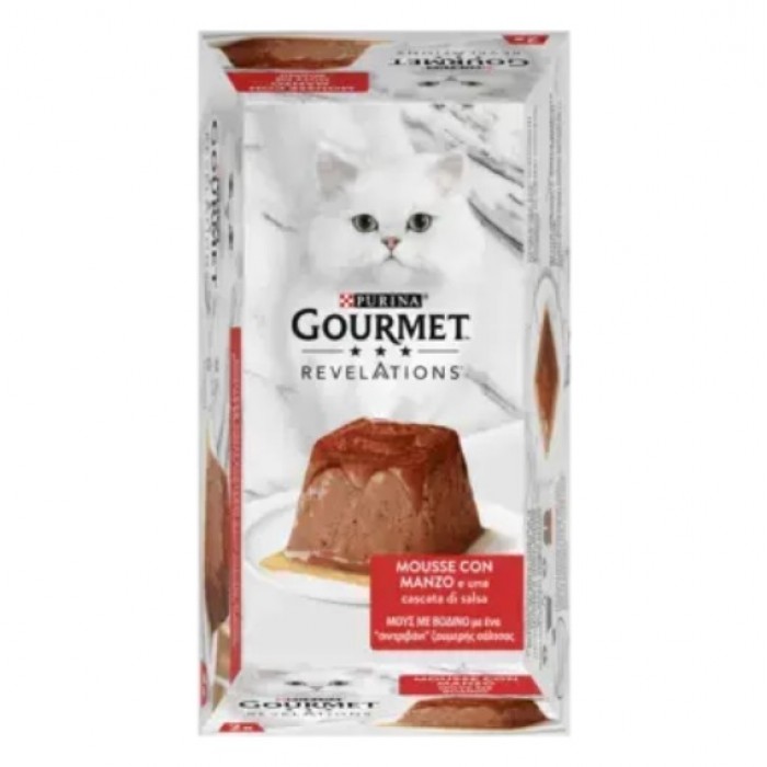 Вишуканий формат харчування для домашніх улюбленців — Gourmet Revelations Мус з яловичиною та підливкою — це повнораціонний вологий корм преміум-класу, створений спеціально для дорослих котів.