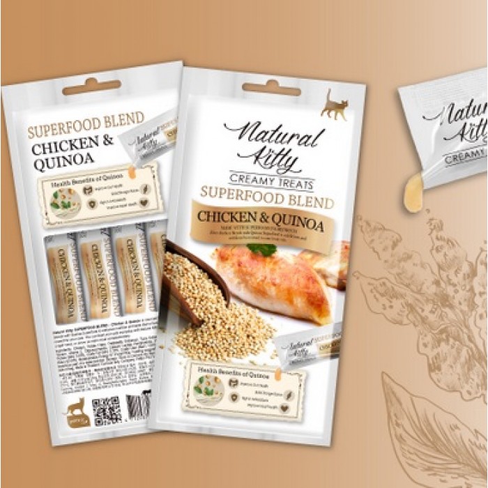 Кремові стіки виготовлені зі 100% справжньої курятини та змішані з кіноа (суперпродуктом), щоб зберегти поживні переваги кіноа та створити смачне частування, яке, як було доведено, сприятливе для котів. Це найкраща щоденна нагорода для ваших котів. Ви можете щодня годувати своїх котів вершковими ласощами Natural Kitty Creamy Treats як нагороду, або як ласощі, або як легку їжу або як доповнення до основної їжі ваших котів. Кіноа не містить глютену, має високий вміст білка та є одним із небагатьох рослинних продуктів, які містять достатню кількість усіх незамінних амінокислот. Він також містить багато клітковини, магнію, вітамінів групи В, заліза, калію, кальцію, фосфору, вітаміну Е та цілого ряду корисних антиоксидантів.