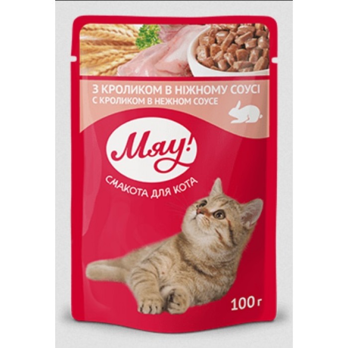 Опис Мяу, вологий корм для котів, з кроликом в ніжному соусі, 85 г