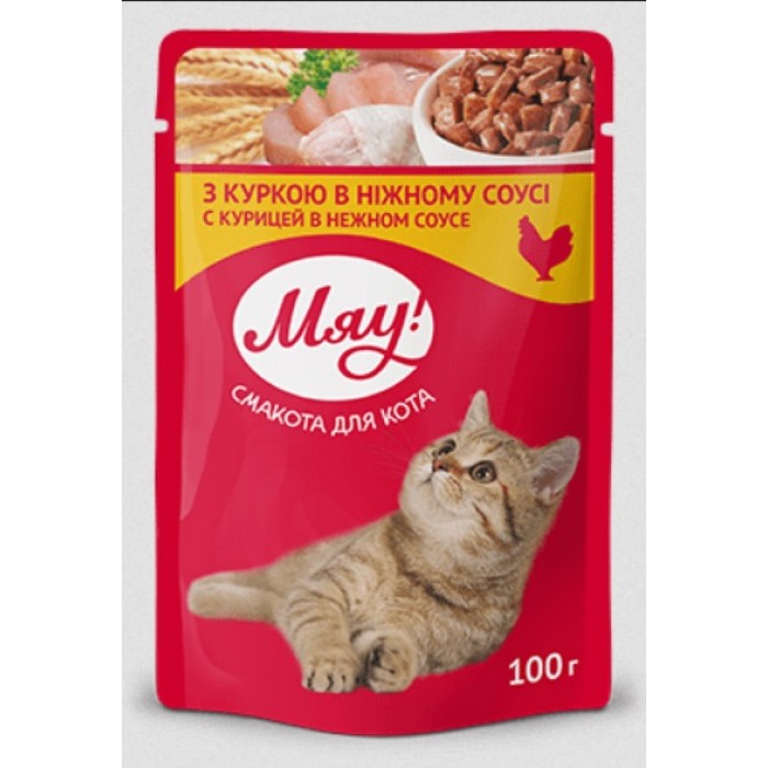 Опис Мяу, вологий корм для котів, з куркою в ніжному соусі, 85 г