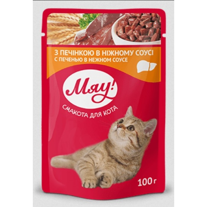 Опис Мяу, вологий корм для котів, з печінкою в ніжному соусі, 85 г