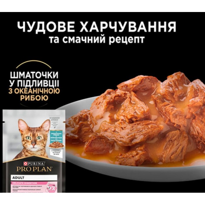 Опис Purina Pro Plan Delicate Digestion, вологий корм для котів, чутливе травлення, з рибою, шматочки у підливці, пауч, 85 г