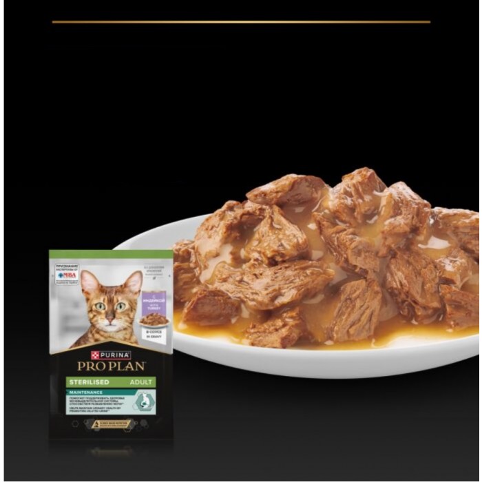 Основні характеристики Purina Pro Plan Sterilised, вологий корм для стерилізованих котів, з індичкою, пауч, 85 г