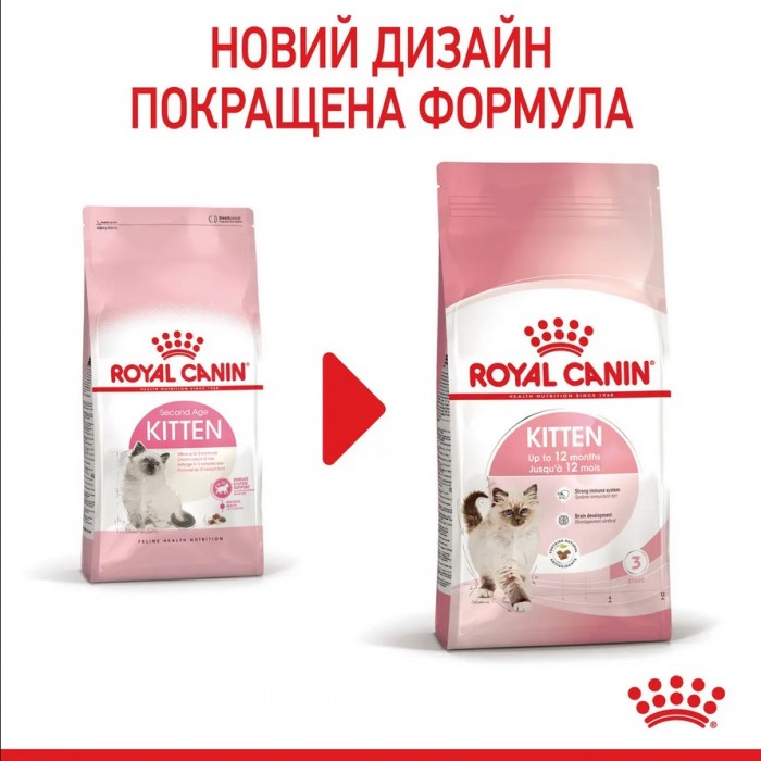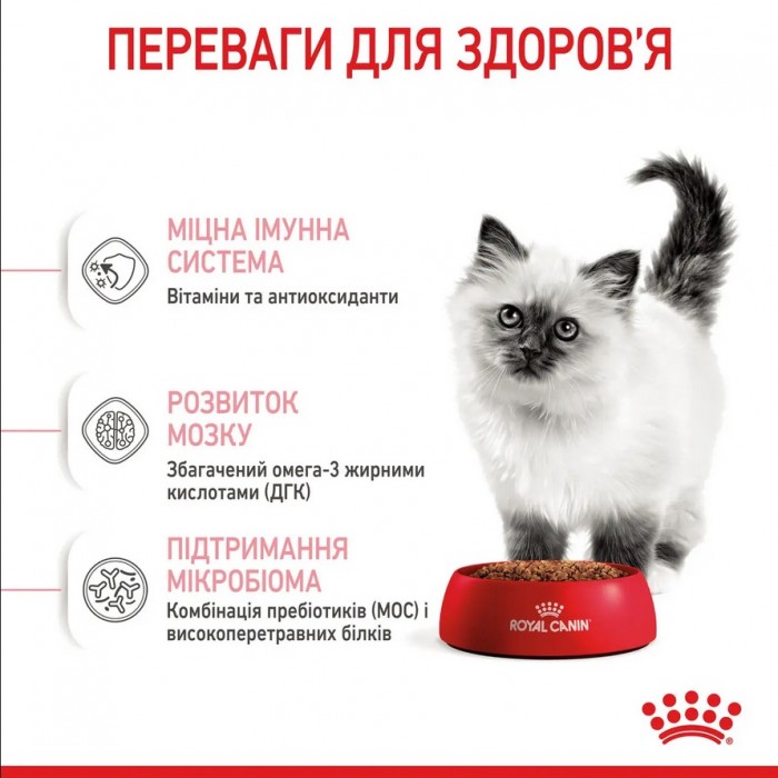 Чи годують дитину так само як дорослу людину? Очевидно, що ні. Діти мають чутливу травну систему, маленькі щелепи, у них немає зубів, тому вони, наприклад, не можуть відкусити яблуко. Ці факти полегшують розуміння того, чому кошенятам також потрібен не такий корм, як дорослим котам. Ріст кошенят триває не менше 12 місяців, залежно від породи та статі. Гама раціонів ROYAL CANIN Kitten має оптимальні рішення для кошенят. Оберіть для них найкращі вологі та сухі раціони. Маленькі крокети – легке розгризання. Компанія ROYAL CANIN є лідером у технології розробки крокет. Розмір, форма, текстура та щільність розроблені з урахуванням специфічних особливостей кошенят.