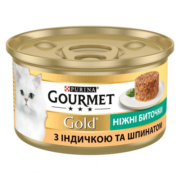 Опис Вологий корм Purina Gourmet Gold Ніжні биточки для котів, з індичкою і шпинатом, 85 г