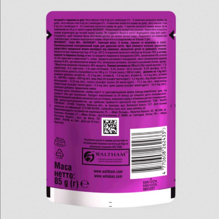 Відгуки про Whiskas Tasty Mix (Віскас Тесті Мікс), вологий корм для дорослих котів, з ягням, куркою та морквою в соусі, 85 г