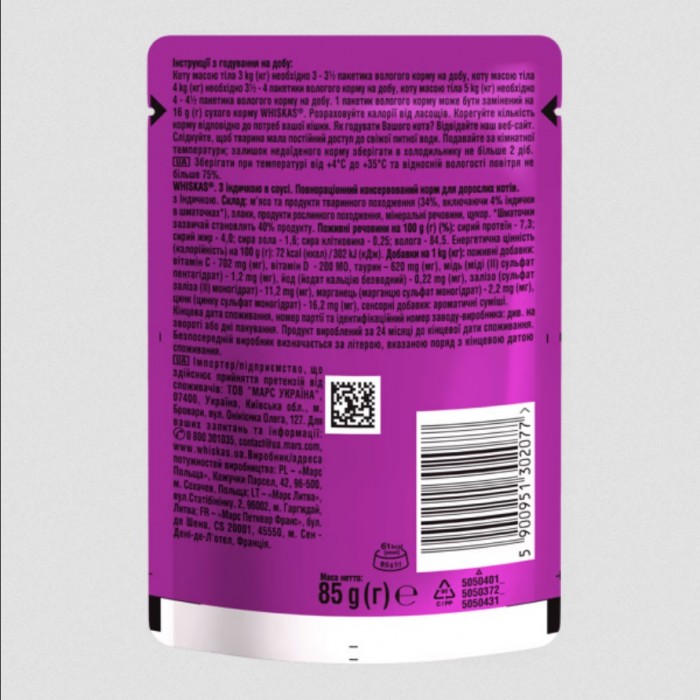 Основні характеристики Whiskas (Віскас), вологий корм для дорослих котів, з індичкою, шматочки в соусі, 85 г