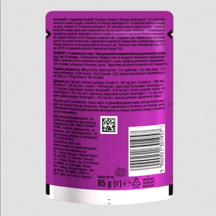 WHISKAS ® розуміє природні потреби кошенят. Ось чому кожен пакетик містить поживні шматочки м’яса з різними смаками, щоб ваше кошеня могло відкрити для себе нові смаки та текстури, які дадуть йому здоровий старт у житті. Наші формули спеціально розроблені, щоб допомогти вашому кошеняті вирости здоровим котом - з кальцієм для підтримки розвитку кісток - вітаміном Е та мінералами для підтримки імунної системи. Без штучних барвників, ароматизаторів та консервантів.