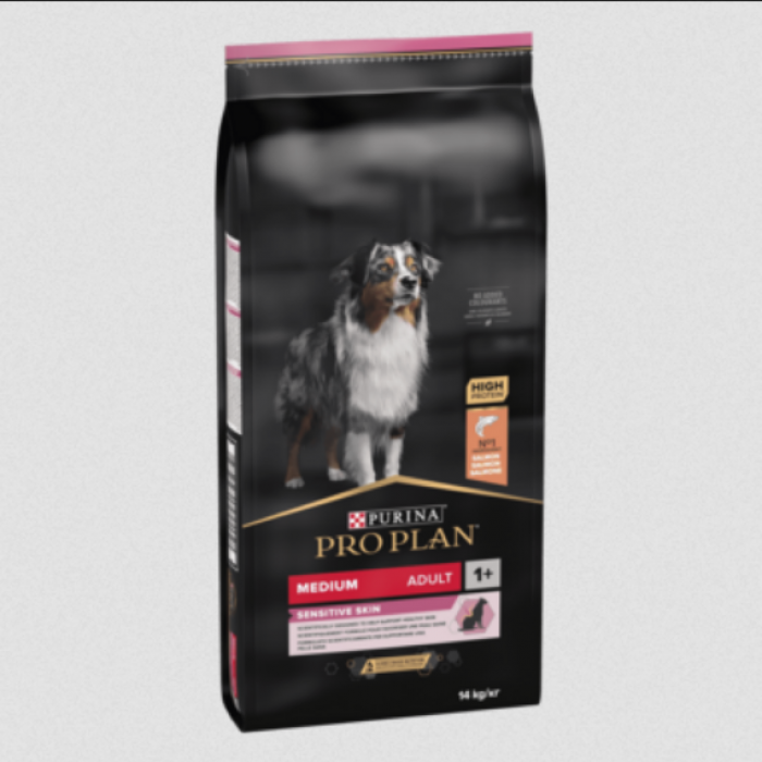 Purina Pro Plan Adult Medium Sensitive Skin OptiDerma Salmon - повнораціонний сухий корм для дорослих собак середніх порід (вагою від 10 до 25 кг) з чутливою шкірою.