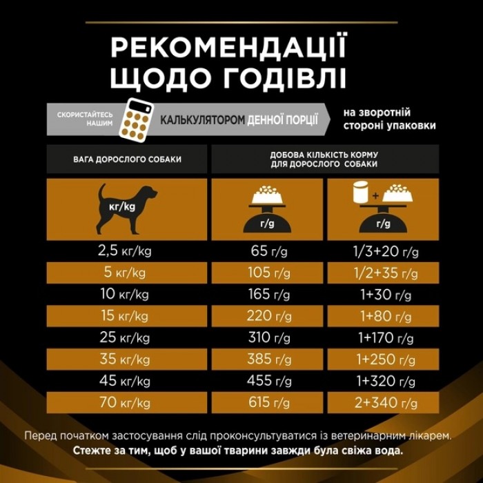 Для собак вагою понад 70 кг: на кожні додаткові 5 кг ваги додавайте 30г сухого корму. Тривалість годування, що рекомендується: спочатку до 6 місяців при хронічній нирковій недостатності; до 6 місяців для зменшення утворення уратного каміння, а також протягом усього життя при необоротних порушеннях метаболізму сечової кислоти; спочатку до одного року для зменшення утворення цистинового каміння.