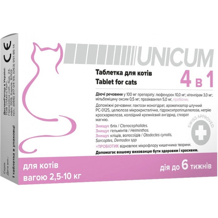 Основні характеристики Unicum 4 в 1, таблетка від бліх та кліщів, від глистів, з пробіотиком, для котів від 2,5 до 10 кг, 1 табл.