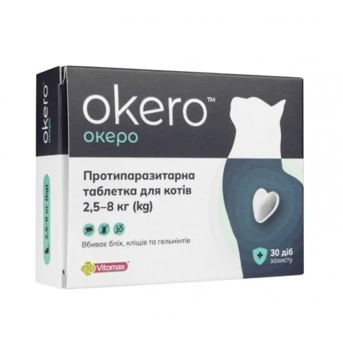 Опис Vitomax Okero (ОКЕРО), таблетка від бліх, кліщів, гельмінтів, для котів від 2,5 до 8 кг, зі смаком лосося, 1 табл.