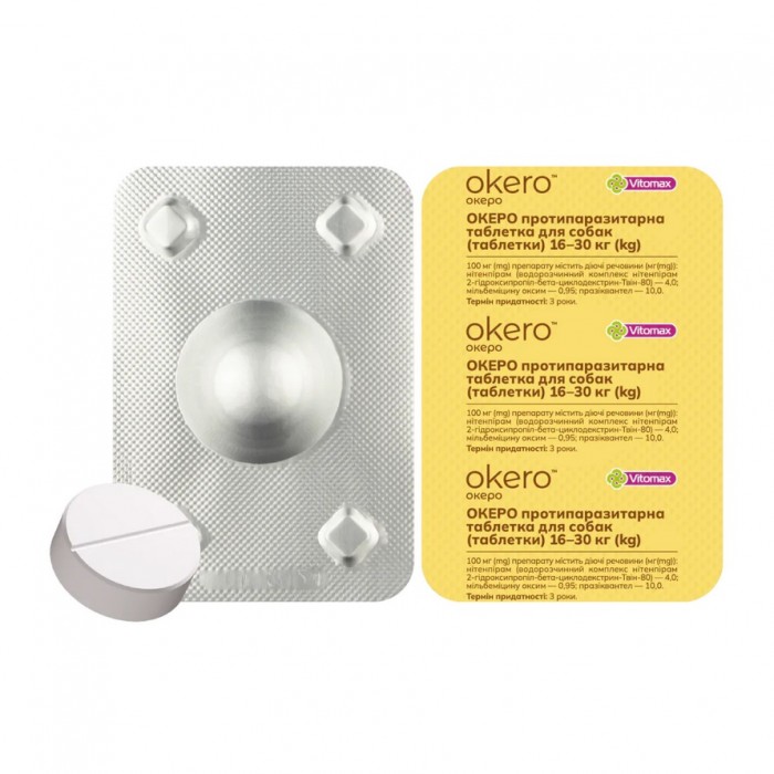 Протипаразитарна таблетка для собак ОКЕРО – паразитицидний засіб у вигляді таблеток, що застосовується для профілактики та лікування собак проти зовнішніх паразитів (членистоногих: бліх, кліщів, тощо), а також проти внутрішніх паразитів (нематод, цестод).