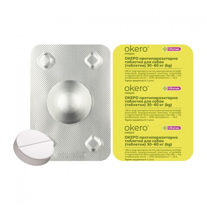 Протипаразитарна таблетка для собак ОКЕРО – паразитицидний засіб у вигляді таблеток, що застосовується для профілактики та лікування собак проти зовнішніх паразитів (членистоногих: бліх, кліщів, тощо), а також проти внутрішніх паразитів (нематод, цестод).